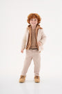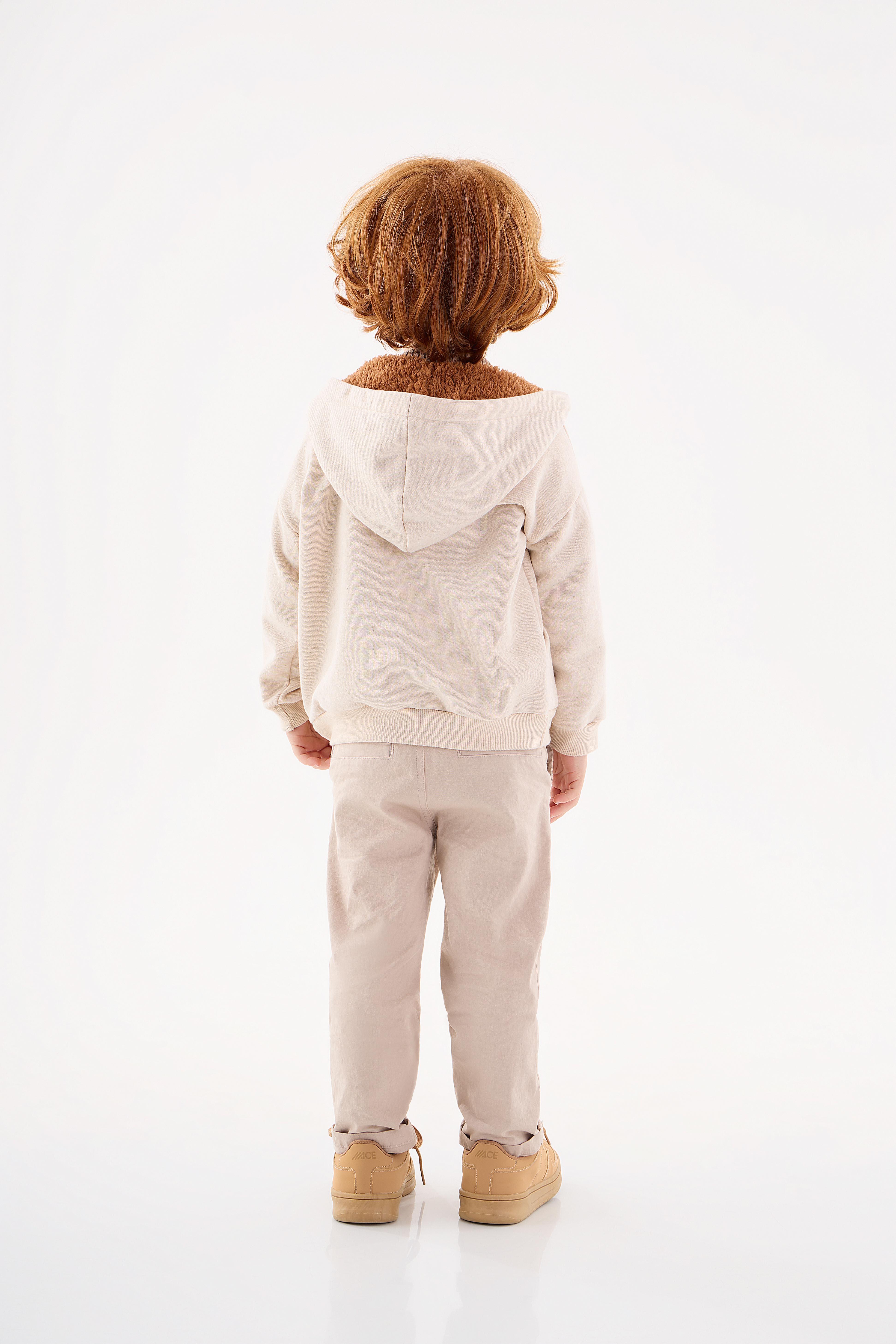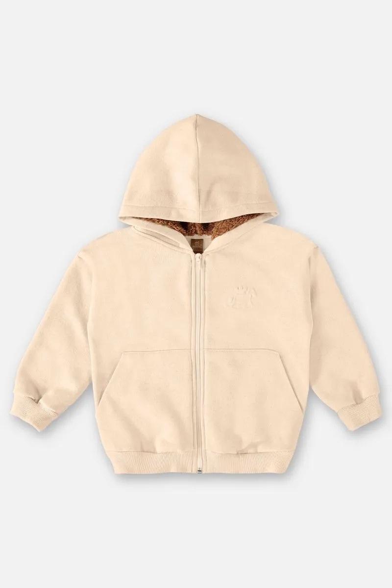 Jaqueta infantil para meninos confeccionada em moletom linho. Possui capuz forrado em material sintético (simulando pelo), abertura frontal com zíper, bolsos, bordado da marca, punhos e barra em ribana.